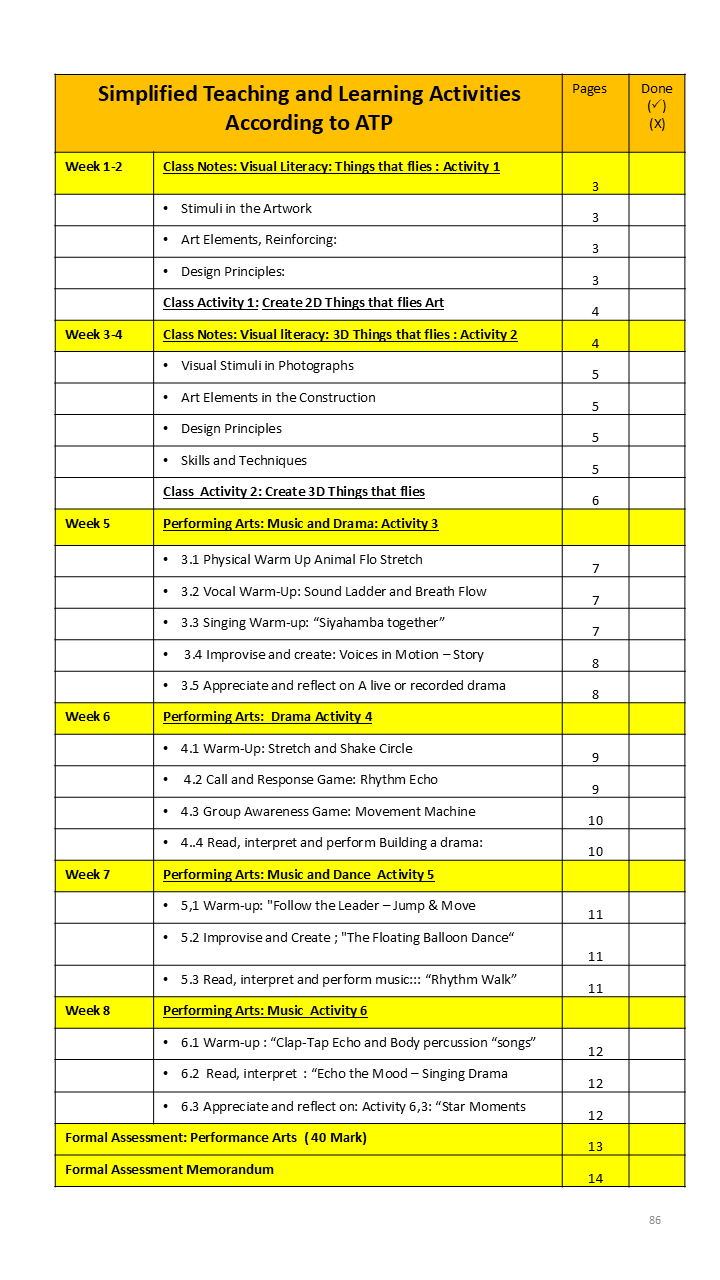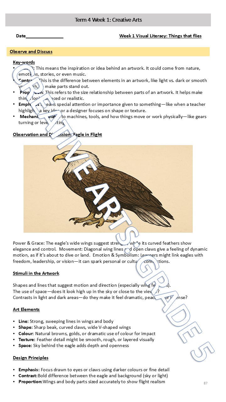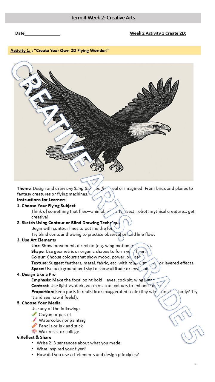 This Creative Arts resource supports weekly learning through structured class notes and engaging activities in drama, dance, music and visual arts. Learners explore movement, performance, expression, and design while building creative confidence. Formal assessments provide opportunities to apply skills in practical with clear guidelines to support fair evaluation.