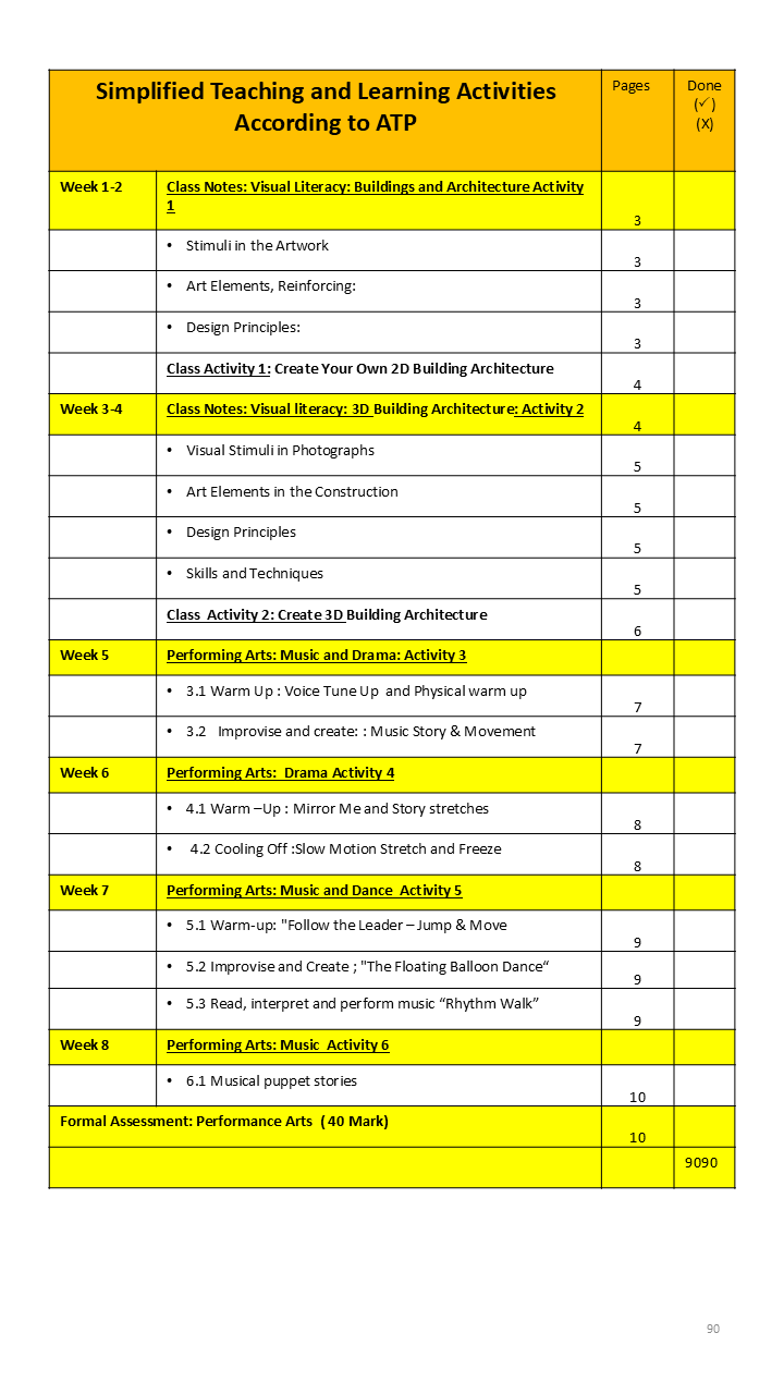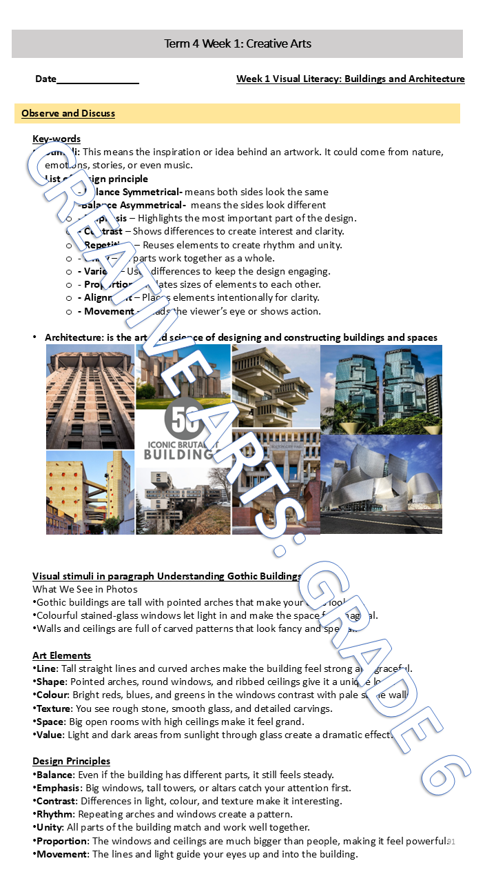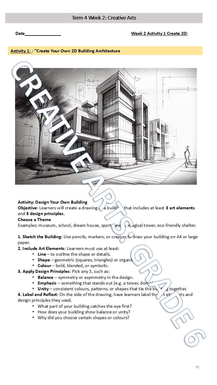 This Creative Arts resource supports weekly learning through structured class notes and engaging activities in drama, dance, music and visual arts. Learners explore movement, performance, expression, and design while building creative confidence. Formal assessments provide opportunities to apply skills in practical with clear guidelines to support fair evaluation.
