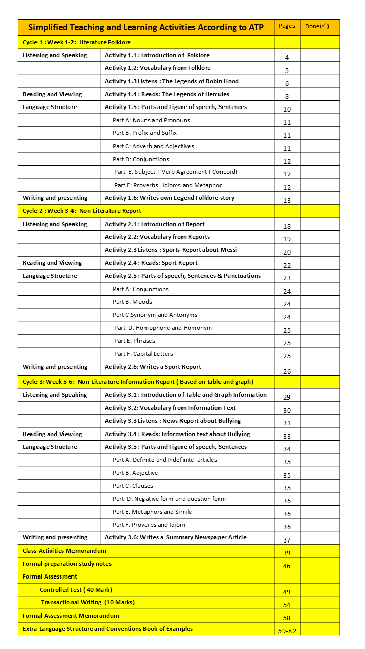 This document outlines weekly classroom activities and formal assessments. Learners will engage in Listening and Speaking, Reading and Viewing, Language Structure, and Writing and Presenting tasks. A Class Activities Memorandum and Study Revision Notes support ongoing learning. Formal assessments include a Controlled Test and a Writing Test, with clear guidelines provided in the Formal Assessment Memorandum.